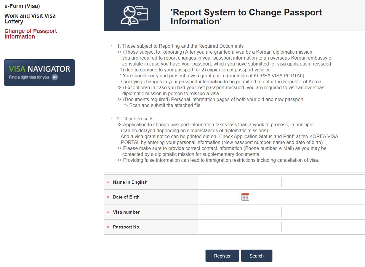 Sau khi hoàn tất quá trình chuyển đổi visa Hàn Quốc từ hộ chiếu cũ sang hộ chiếu mới, bạn có thể tra cứu trạng thái cập nhật thông tin hộ chiếu bằng cách truy cập vào https://www.visa.go.kr/ >> Application >> Change of Passport Information