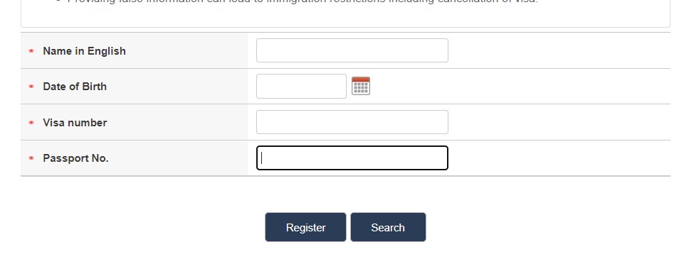 ► Bước 5: Bạn tiến hành nhập thông tin bao gồm họ tên (không dấu), ngày tháng năm sinh, số Visa, số hộ chiếu cũ. Sau đó chọn ‘Register’